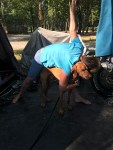 July 1st we arrived back in England at around 7:30, first stop was the petrol station at the exit to the tunnel where the now traditional “Theresa hug” took place. Always great to see my skin and blister. The night before had been long for me as I had not slept. We (Denise) had driven over 600 miles to get to the tunnel and the plan had been to check in and wait in the car park for our train even though it would have been a long wait. We have done this before, so we expected that to go without a hitch. As my Mum used to say “you know what thought did”. Jarjar was chip checked and his passport checked to ensure we had paid a vet a large amount of money to give him a worming tablet and we were ready for the off. At the toll booth we were politely told to go away so we returned to the pet registration car park to wait for a few hours. It became apparent that lots of other travellers had been told to do the same, I do mean travellers, so we shared the car park with loud naughty confrontational nippers who used the railings as drums just to make sure everyone knew they were there, loud aggressive looking men and even more aggressive looking women. I was also concerned that as we were outside of the perimeter fencing there was a distinct possibility we would have some uninvited guests. Denise slept, I watched Star Wars movies until it was light with my selfie stick at its medium extended length in case I needed to be a little more firm with my “get of my motorhome you naught person” (or something along those lines). None of that drama occurred as could have been predicted however you never can be too sure and I certainly was prepared, having watched 4 hours of Jedi masters I could have taken on anyone in my delirious state.